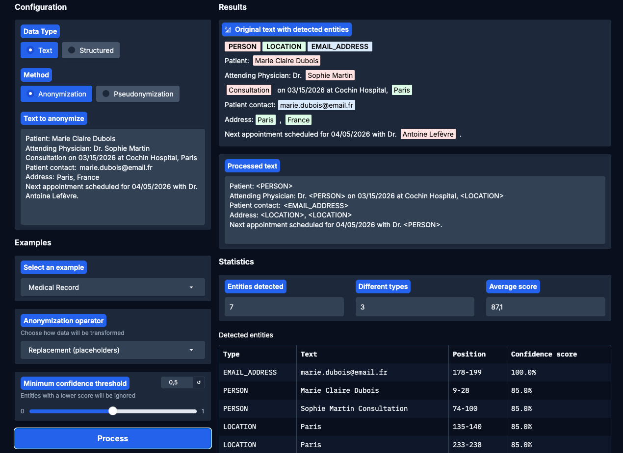 The Inonyma Data De-Identifier stands as a technology in the realm of data protection, crafted to convert sensitive information into secure, usable data sets. At its core, this tool addresses the critical need for privacy by enabling the automatic detection and anonymization (or pseudonymization) of Personally Identifiable Information (PII) across a variety of data formats. Whether dealing with plain text, complex JSON structures, or extensive documents, organizations can seamlessly integrate this technology to safeguard privacy without sacrificing data utility.